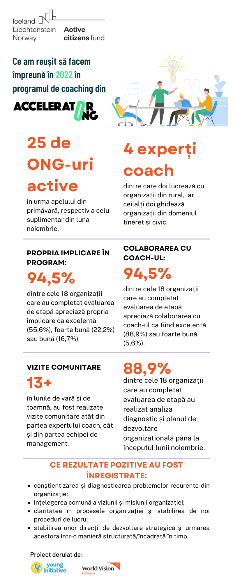 - Continuarea implementării proiectului „Acceleratorul de sustenabilitate pentru ONG-uri”, finanțat prin Active Citizens Fund România, alături de partenerii de la World Vision România, prin intermediul căruia 25 de organizații non-guvernamentale din România au intrat într-un proces accelerat de dezvoltare organizațională cu ajutorul unui expert coach dedicat. În 2022, organizațiile din program au început analiza diagnostic, au continuat cu identificarea obiectivelor pentru planul de dezvoltare organizațională, iar spre finalul anului au trecut la partea de implementare. Totodată, experții coach alături de membrii echipei de management au realizat o serie de vizite comunitare în vederea înțelegerii specificului și nevoilor organizațiilor în mediul în care activează. O parte importantă din proiect a fost reprezentată și de începerea lucrului la cursurile online care susțin procesul de învățare a organizațiilor și sunt axate pe trei tematici: comunicare nonprofit, buna guvernanță în ONG-uri, respectiv reziliență organizațională. Mai multe informații despre rezultatele obținute în 2022 pot fi regăsite în acest infografic.