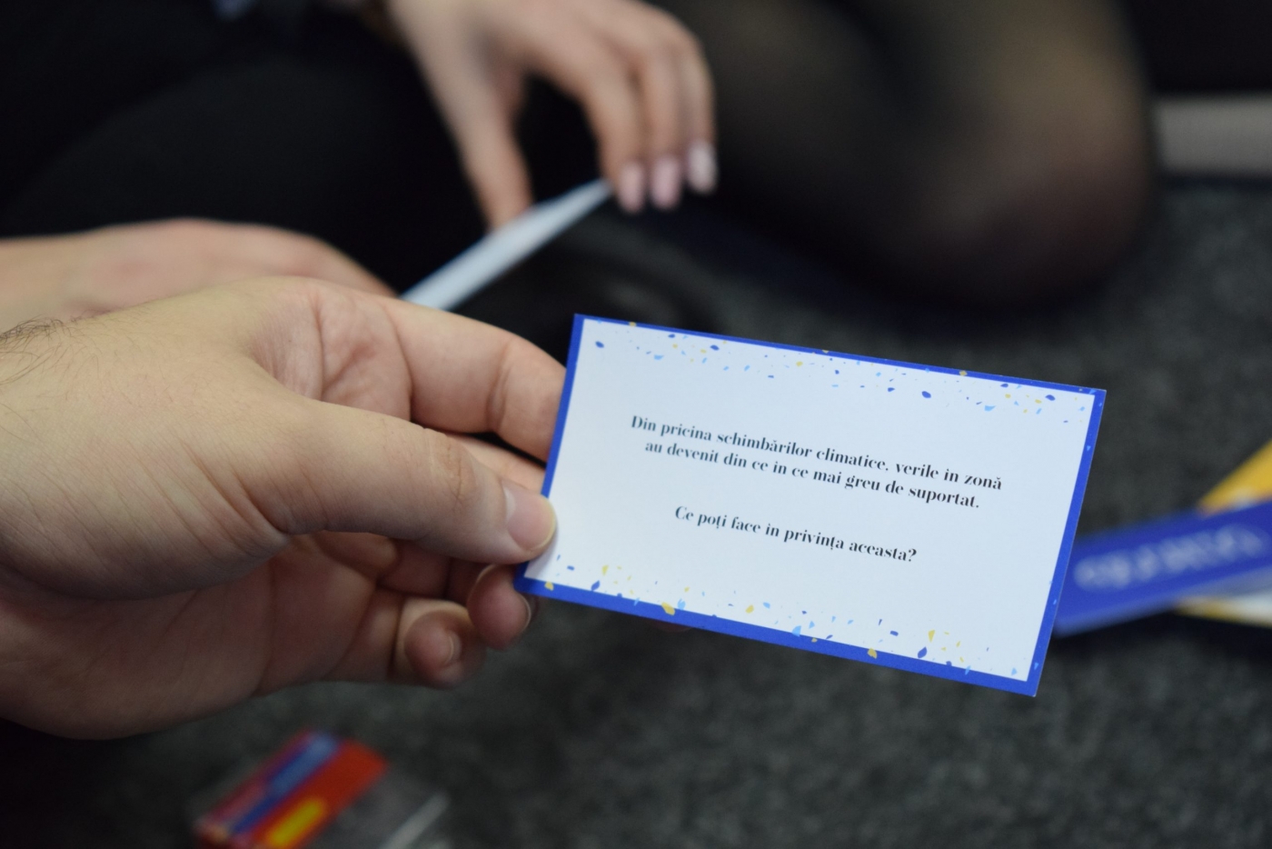 Cărțile în această culoare au scrise pe ele diverse situații ipotetice la care trebuie să răspundă jucătorul care extrage cartea respectivă. În cele mai multe dintre cazuri este vorba de o problemă din comunitate de rezolvat.