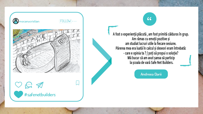 Cyberbullyingul este o problemă cu care noi, tinerii, ne întâlnim din ce în ce mai des. Cu toate acestea, nu știm cum să îi facem față sau cum să îi ajutăm pe cei care se confruntă cu ea. Am participat la școala de vară Safe Net Builders și în cadrul căreia am învățat cum pot face față unei situații de cyberbullying, cum mă pot apăra din punct de vedere legal și cum îmi pot ajuta prietenii care se confruntă cu asta. A fost interesant să dezbat cu tineri de vârsta mea și să aflu părerile tuturor, întreaga activitate fiind educativă și creativă.